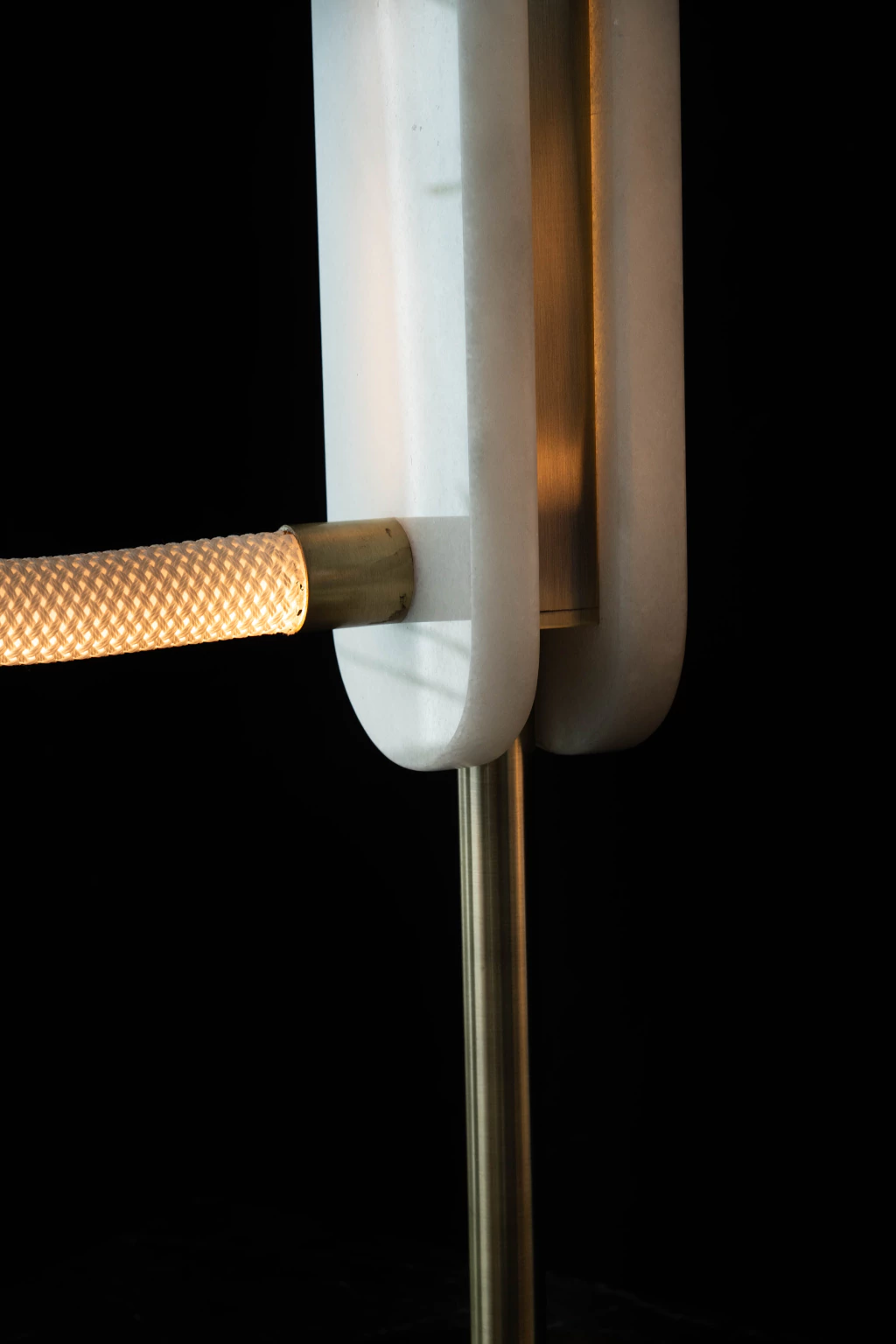 Vínculo es una lámpara de diseño contemporáneo que combina mármol natural translúcido y latón pulido en una pieza que es tanto escultórica como funcional.